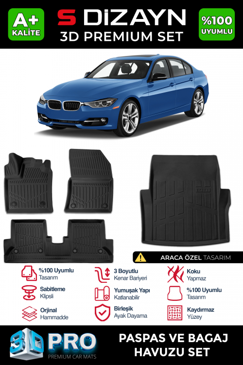 S-Dizayn Bmw 3 Serisi F30 3D Pro Havuzlu Paspas ve Bagaj Havuzu Seti (2'li SET) 2012-2019 A+ Kalite