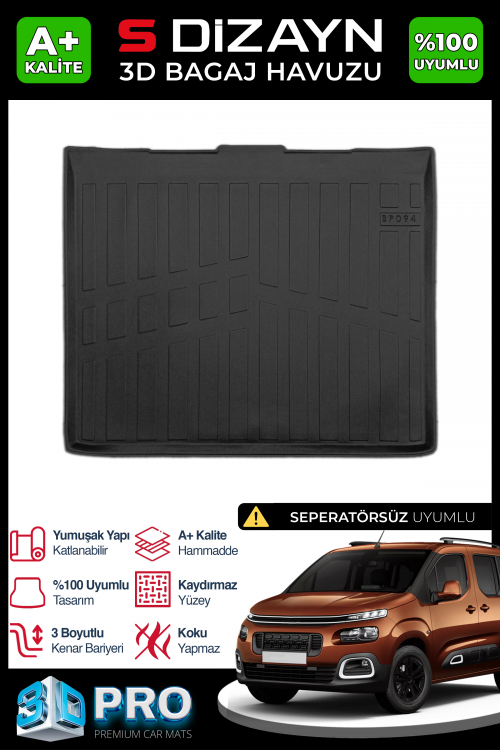 S-Dizayn Citroen Berlingo Seperatörsüz 3D Pro Bagaj Havuzu 2019 Üzeri A+ Kalite