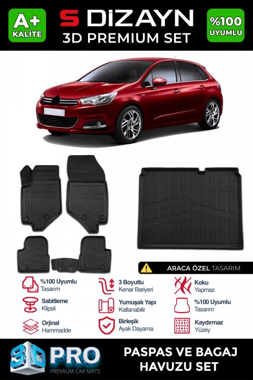 S-Dizayn Citroen C4 3D Pro Havuzlu Paspas ve Bagaj Havuzu Seti (2'li SET) 2010-2018 A+ Kalite