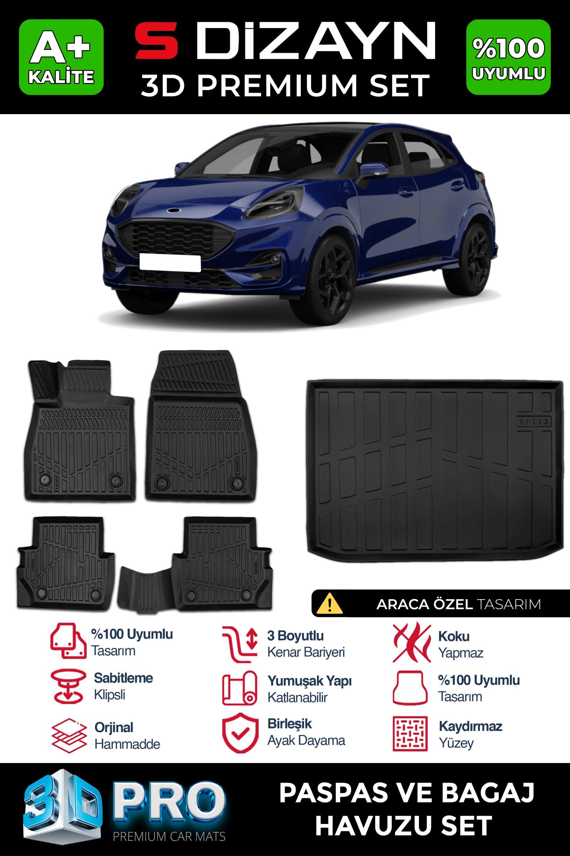 S-Dizayn Ford Puma 3D Pro Havuzlu Paspas ve Bagaj Havuzu Seti (2'li SET) 2019 Üzeri A+ Kalite
