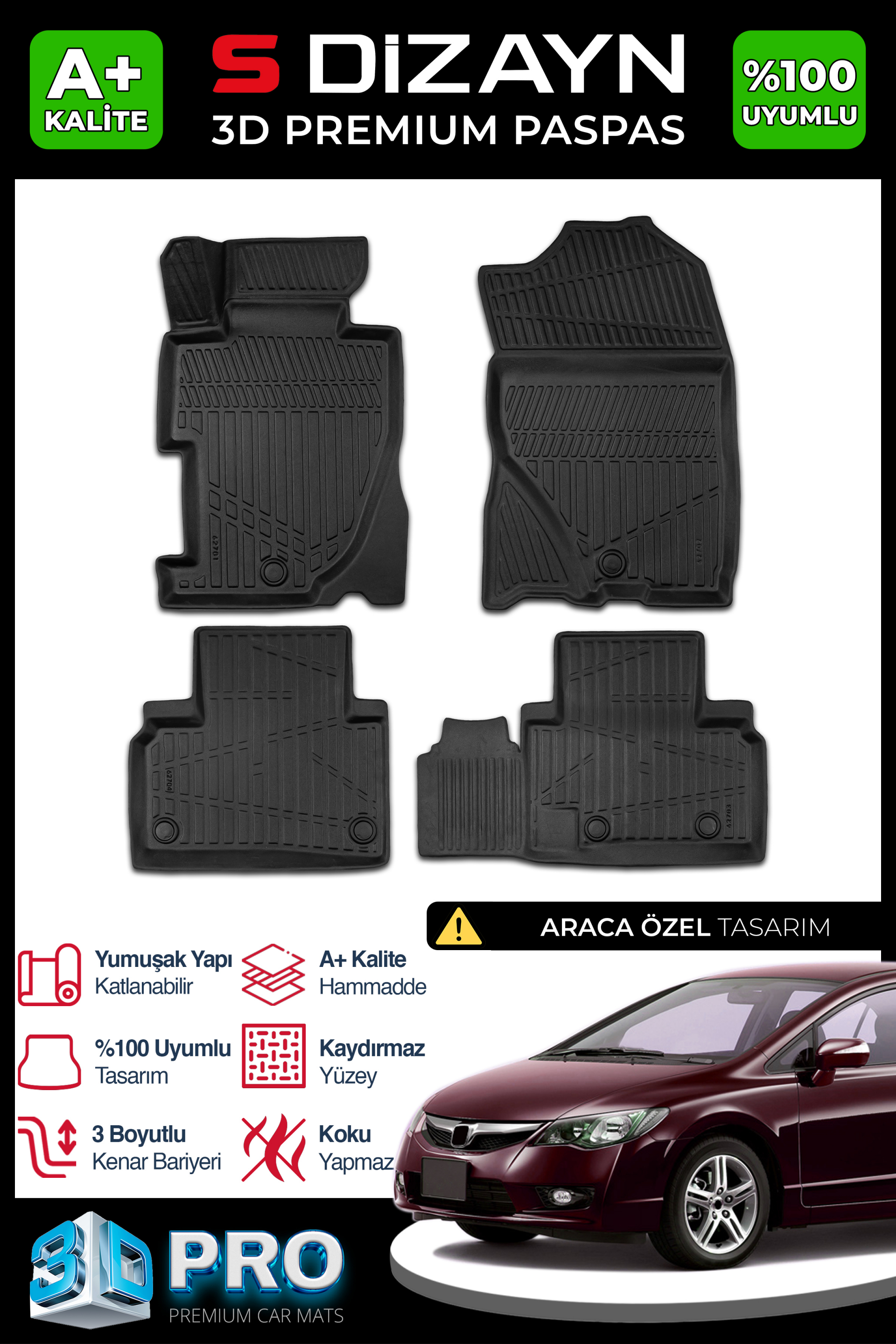 S-Dizayn Honda Civic 3D Pro Havuzlu Paspas 2006-2012 A+ Kalite