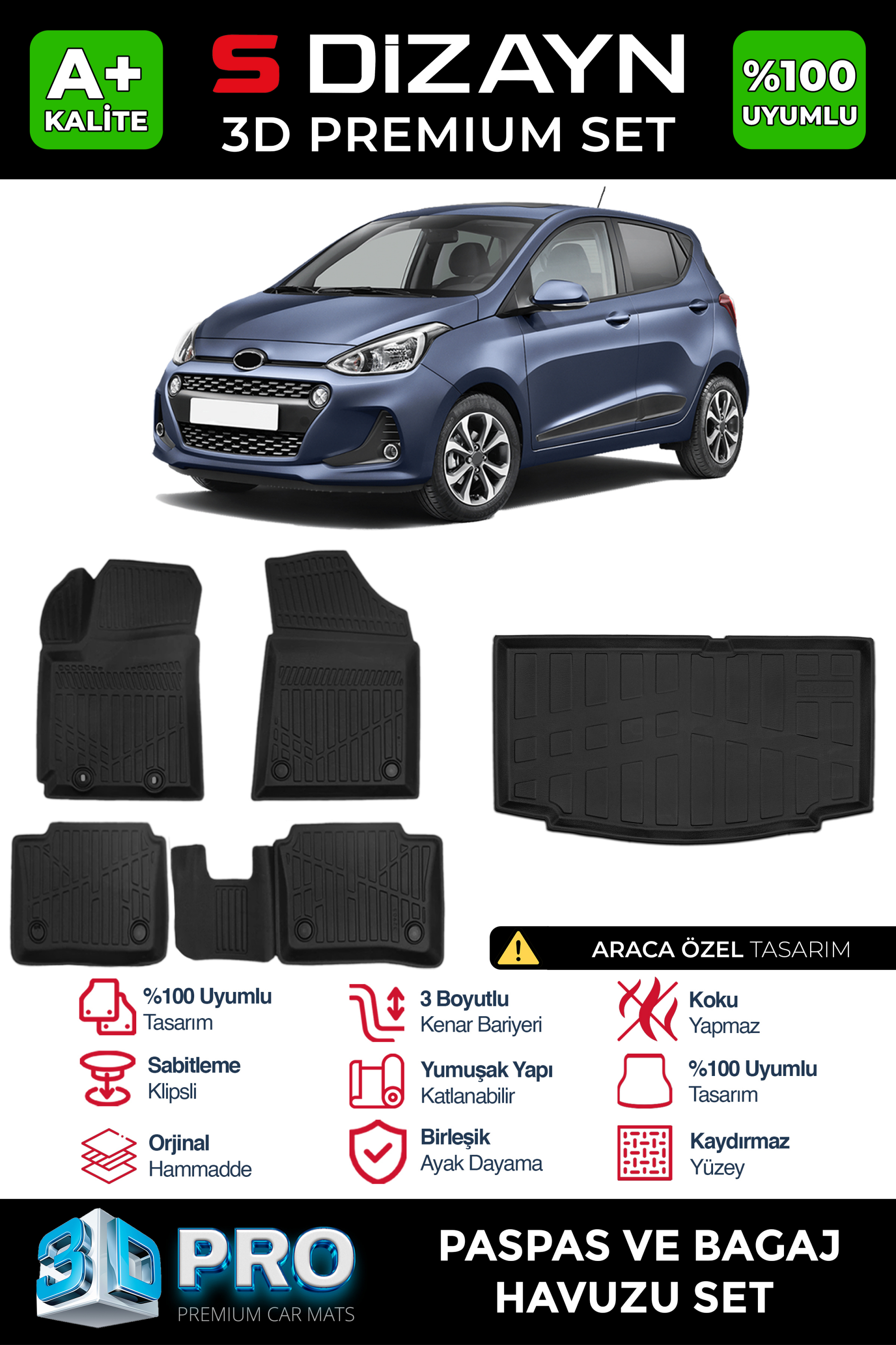 S-Dizayn Hyundai i10 3D Pro Havuzlu Paspas ve Bagaj Havuzu Seti (2'li SET) 2013-2019 A+ Kalite