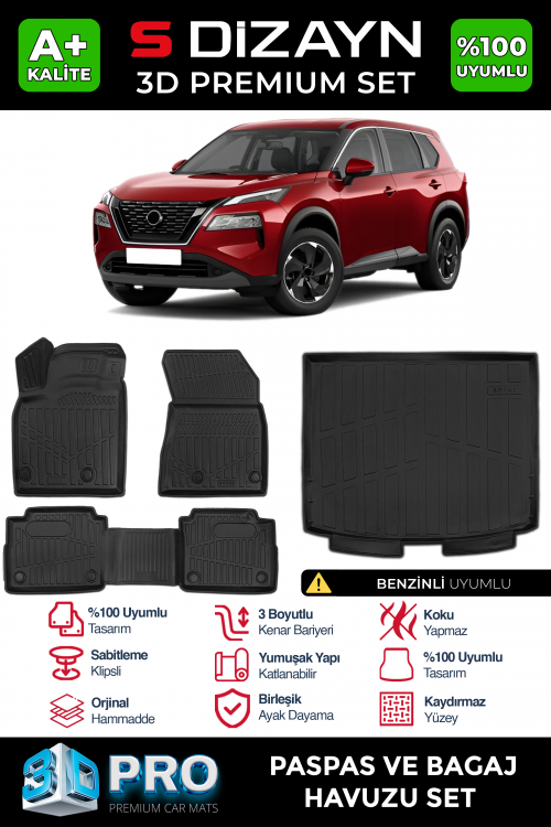 S-Dizayn Nissan X-Trail Benzinli 3D Pro Havuzlu Paspas ve Bagaj Havuzu Seti (2'li SET) 2022 Üzeri A+ Kalite