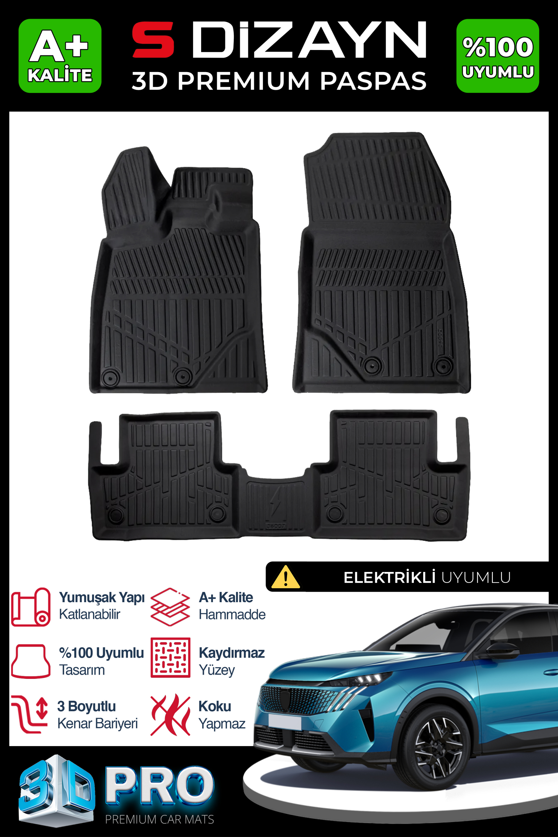 S-Dizayn Peugeot 3008 3 Elektrikli 3D Pro Havuzlu Paspas 2024 Üzeri A+ Kalite