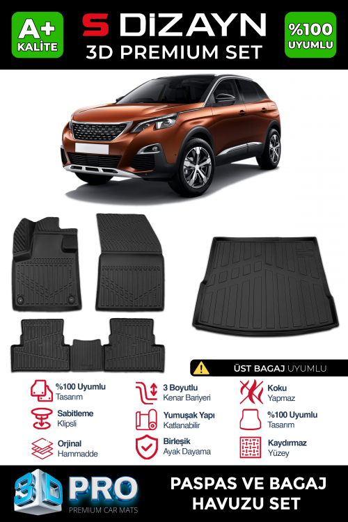 S-Dizayn Peugeot 3008 3D Pro Havuzlu Paspas ve Üst Bagaj Havuzu Seti (2'li SET) 2016-2023 A+ Kalite
