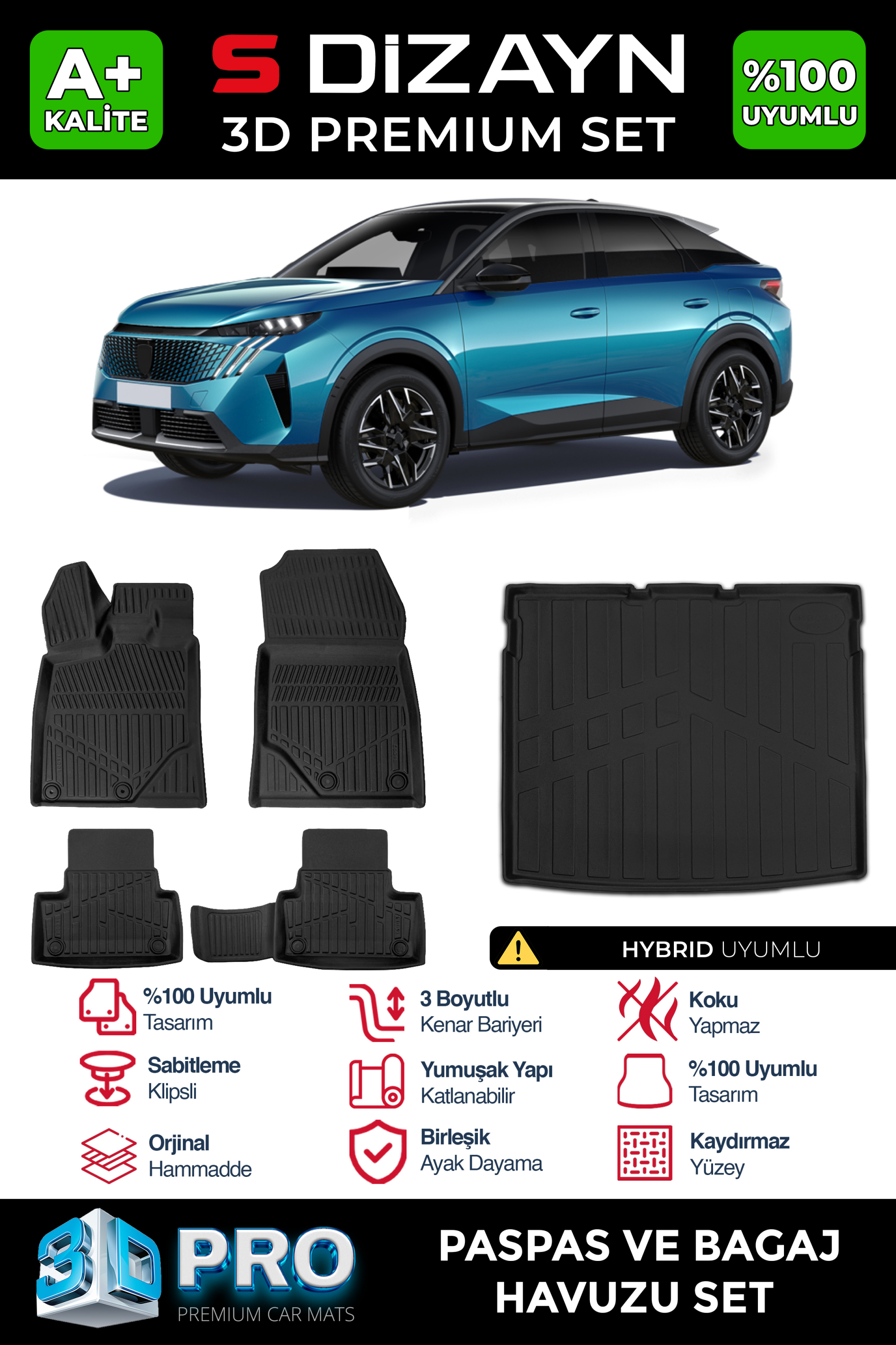 S-Dizayn Peugeot 3008 Hybrid 3D Pro Havuzlu Paspas ve Bagaj Havuzu Seti (2'li SET) 2024 Üzeri A+ Kalite