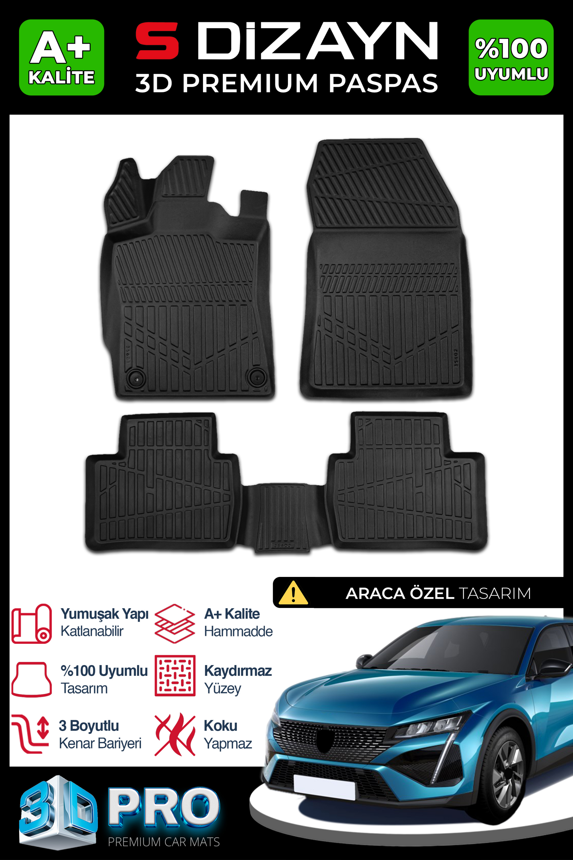 "3D Havuzlu Paspas," her araç modeli için özel olarak ölçülendirilmiş ve tasarlanmıştır. Bu sayede, aracınızın zeminine tam uyum sağlar, boşluk bırakmaz ve kaymadan güvenli bir kullanım sunar.