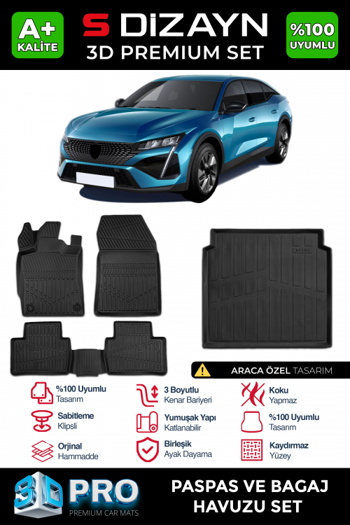 S-Dizayn Peugeot 408 3D Pro Havuzlu Paspas ve Bagaj Havuzu Seti (2'li SET) 2023 Üzeri A+ Kalite