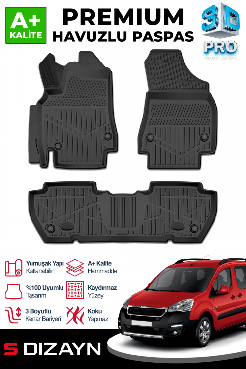 S-Dizayn Peugeot Partner Tepee 3D Pro Havuzlu Paspas 2008-2018 Üzeri A+ Kalite