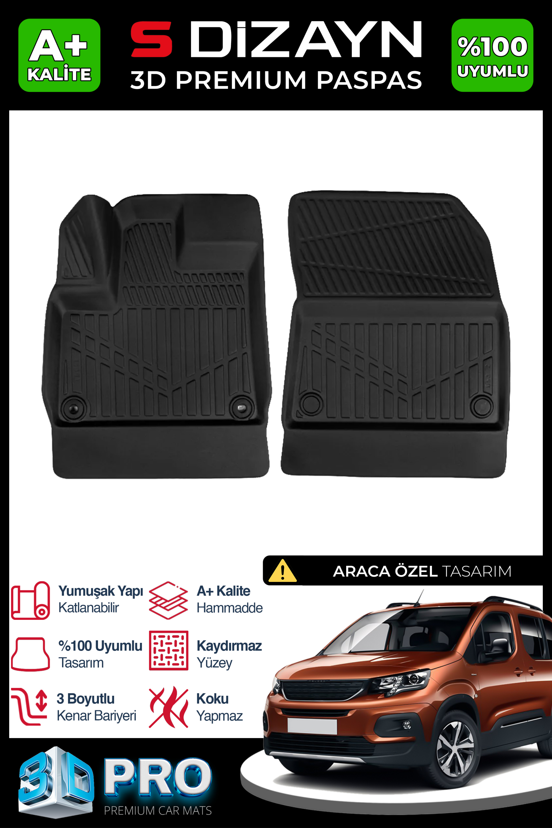 S-Dizayn Peugeot Rifter Panelvan 3D Pro Havuzlu Paspas Ön 2'li 2019 Üzeri A+ Kalite