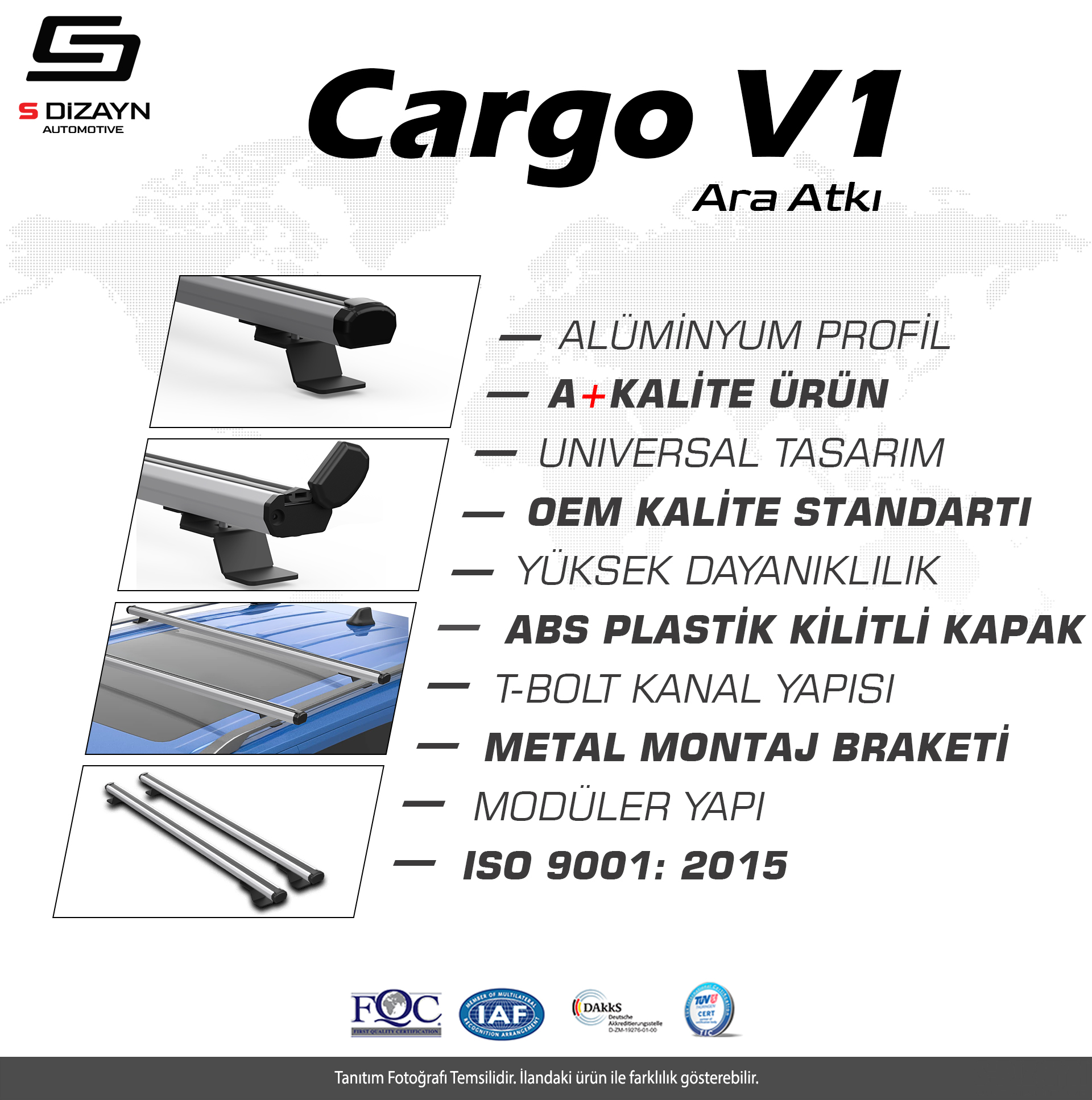 Yapışık tip tavan çıtası, vidalı tip tavan çıtası veya tavan çıtası olmayan araçlar ile uyumlu değildir!