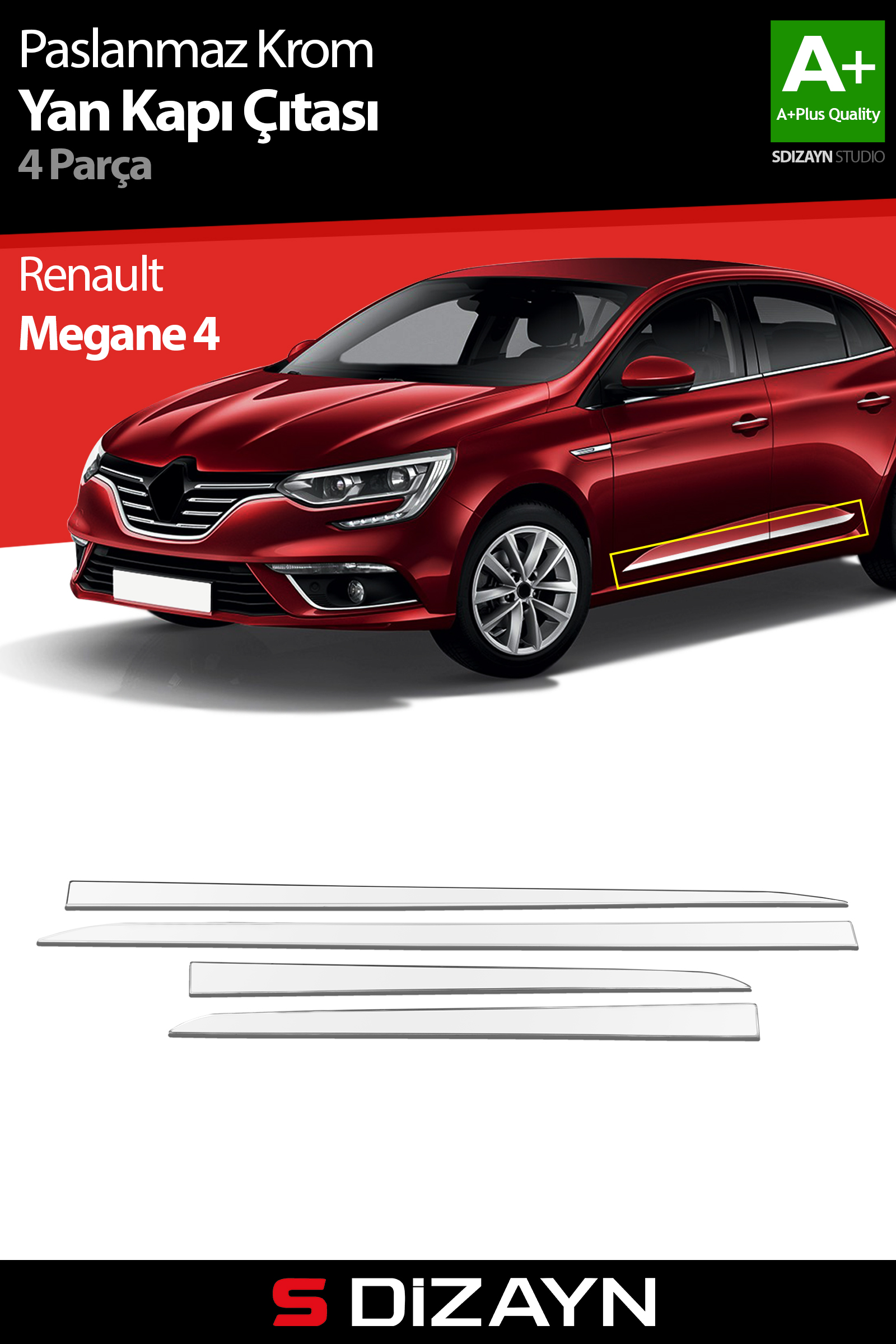 S-Dizayn Renault Megane 4 Krom Yan Kapı Çıtası 4 Prç 2016 Üzeri A+ Kalite