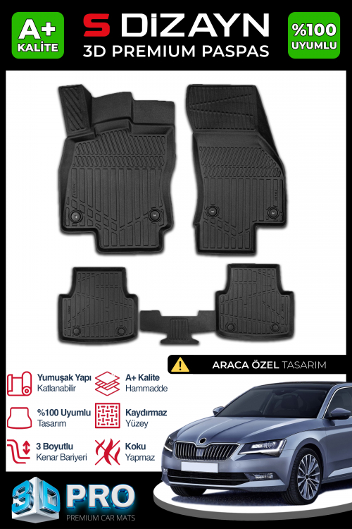 S-Dizayn Skoda SuperB 3D Pro Havuzlu Paspas 2015-2023 A+ Kalite