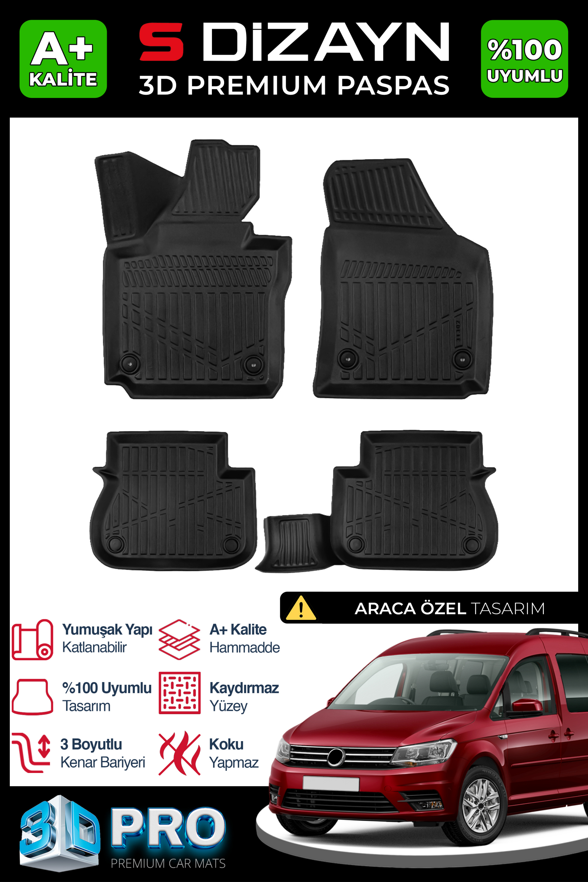 S-Dizayn VW Caddy 3D Pro Havuzlu Paspas 2004-2010 A+ Kalite