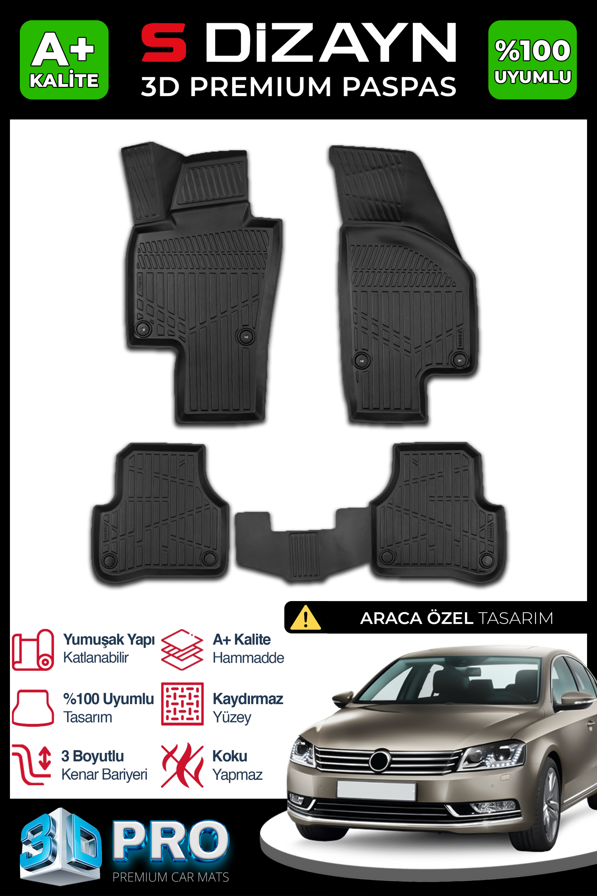 S-Dizayn VW Passat B7 3D Pro Havuzlu Paspas 2010-2014 A+ Kalite